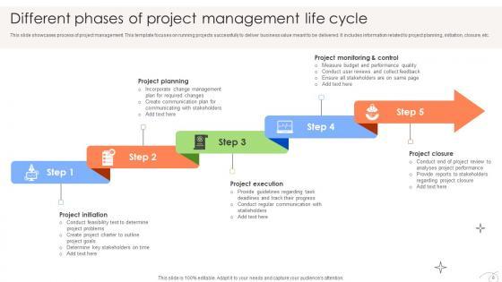 This slide showcases process of project management. This template focuses on running projects successfully to deliver business value meant to be delivered. It includes information related to project planning, initiation, closure, etc. From laying roadmaps to briefing everything in detail, our templates are perfect for you. You can set the stage with your presentation slides. All you have to do is download these easy-to-edit and customizable templates. Executing And Monitoring Project Different Phases Of Project Management PM SS V will help you deliver an outstanding performance that everyone would remember and praise you for. Do download this presentation today. This slide showcases process of project management. This template focuses on running projects successfully to deliver business value meant to be delivered. It includes information related to project planning, initiation, closure, etc.