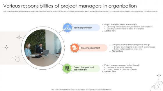 This slide showcases responsibilities of project managers. This template focuses on directing, managing and motivating team members in positive manner. It includes information related to time management, estimating costs, etc. This Executing And Monitoring Project Various Responsibilities Of Project Managers In Organization PM SS V from Slidegeeks makes it easy to present information on your topic with precision. It provides customization options, so you can make changes to the colors, design, graphics, or any other component to create a unique layout. It is also available for immediate download, so you can begin using it right away. Slidegeeks has done good research to ensure that you have everything you need to make your presentation stand out. Make a name out there for a brilliant performance. This slide showcases responsibilities of project managers. This template focuses on directing, managing and motivating team members in positive manner. It includes information related to time management, estimating costs, etc.