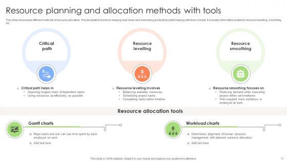 This slide showcases different methods of resource allocation. This template focuses on keeping cists down and maximizing productivity while helping with team morale. It includes information related to resource levelling, smoothing, etc. Welcome to our selection of the Executing And Monitoring Project Resource Planning And Allocation Methods With Tools PM SS V. These are designed to help you showcase your creativity and bring your sphere to life. Planning and Innovation are essential for any business that is just starting out. This collection contains the designs that you need for your everyday presentations. All of our PowerPoints are 100Percent editable, so you can customize them to suit your needs. This multi-purpose template can be used in various situations. Grab these presentation templates today. This slide showcases different methods of resource allocation. This template focuses on keeping cists down and maximizing productivity while helping with team morale. It includes information related to resource levelling, smoothing, etc.