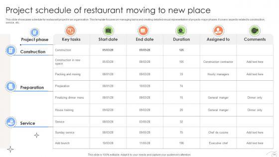 This slide showcases schedule for restaurant project in an organisation. This template focuses on managing tasks and creating detailed visual representation of projects major phases. It covers aspects related to construction, service, etc. This modern and well-arranged Executing And Monitoring Project Schedule Of Restaurant Moving To New PM SS V provides lots of creative possibilities. It is very simple to customize and edit with the Powerpoint Software. Just drag and drop your pictures into the shapes. All facets of this template can be edited with Powerpoint, no extra software is necessary. Add your own material, put your images in the places assigned for them, adjust the colors, and then you can show your slides to the world, with an animated slide included. This slide showcases schedule for restaurant project in an organisation. This template focuses on managing tasks and creating detailed visual representation of projects major phases. It covers aspects related to construction, service, etc