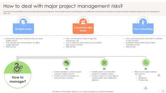 This slide showcases different risks associated with project management. This template focuses on prioritizing tasks and getting team prepared for all obstacles. It includes information related to budget creep, poor scheduling of tasks, etc. Do you have an important presentation coming up Are you looking for something that will make your presentation stand out from the rest Look no further than Executing And Monitoring Project How To Deal With Major Project Management PM SS V. With our professional designs, you can trust that your presentation will pop and make delivering it a smooth process. And with Slidegeeks, you can trust that your presentation will be unique and memorable. So why wait Grab Executing And Monitoring Project How To Deal With Major Project Management PM SS V today and make your presentation stand out from the rest This slide showcases different risks associated with project management. This template focuses on prioritizing tasks and getting team prepared for all obstacles. It includes information related to budget creep, poor scheduling of tasks, etc.