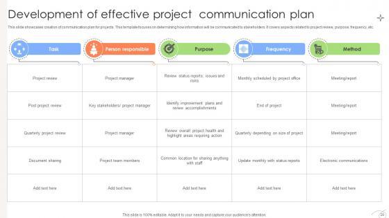 This slide showcases creation of communication plan for projects. This template focuses on determining how information will be communicated to stakeholders. It covers aspects related to project review, purpose, frequency, etc. Get a simple yet stunning designed Executing And Monitoring Project Development Of Effective Project PM SS V. It is the best one to establish the tone in your meetings. It is an excellent way to make your presentations highly effective. So, download this PPT today from Slidegeeks and see the positive impacts. Our easy-to-edit Executing And Monitoring Project Development Of Effective Project PM SS V can be your go-to option for all upcoming conferences and meetings. So, what are you waiting for Grab this template today. This slide showcases creation of communication plan for projects. This template focuses on determining how information will be communicated to stakeholders. It covers aspects related to project review, purpose, frequency, etc.