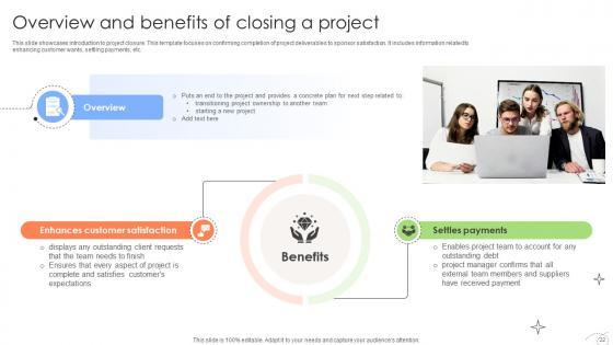 This slide showcases introduction to project closure. This template focuses on confirming completion of project deliverables to sponsor satisfaction. It includes information related to enhancing customer wants, settling payments, etc. Make sure to capture your audiences attention in your business displays with our gratis customizable Executing And Monitoring Project Overview And Benefits Of Closing A Project PM SS V. These are great for business strategies, office conferences, capital raising or task suggestions. If you desire to acquire more customers for your tech business and ensure they stay satisfied, create your own sales presentation with these plain slides. This slide showcases introduction to project closure. This template focuses on confirming completion of project deliverables to sponsor satisfaction. It includes information related to enhancing customer wants, settling payments, etc.