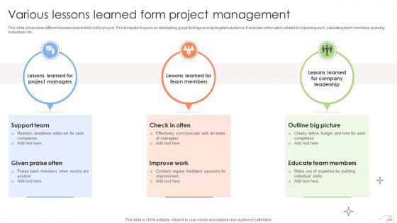 This slide showcases different lessons learnt while in the project. This template focuses on distributing group findings among targeted audience. It includes information related to improving work, educating team members, praising individuals etc. Here you can discover an assortment of the finest PowerPoint and Google Slides templates. With these templates, you can create presentations for a variety of purposes while simultaneously providing your audience with an eye-catching visual experience. Download Executing And Monitoring Project Various Lessons Learned Form Project Management PM SS V to deliver an impeccable presentation. These templates will make your job of preparing presentations much quicker, yet still, maintain a high level of quality. Slidegeeks has experienced researchers who prepare these templates and write high-quality content for you. Later on, you can personalize the content by editing the Executing And Monitoring Project Various Lessons Learned Form Project Management PM SS V. This slide showcases different lessons learnt while in the project. This template focuses on distributing group findings among targeted audience. It includes information related to improving work, educating team members, praising individuals etc.