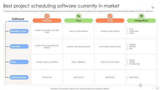 This slide showcases various tools related to project scheduling. This template focuses on visually planning tasks and moving stuff around by dragging elements. It covers aspects related to software such as Runn, Kantata, etc. Create an editable Executing And Monitoring Project Best Project Scheduling Software Currently PM SS V that communicates your idea and engages your audience. Whether you are presenting a business or an educational presentation, pre-designed presentation templates help save time. Executing And Monitoring Project Best Project Scheduling Software Currently PM SS V is highly customizable and very easy to edit, covering many different styles from creative to business presentations. Slidegeeks has creative team members who have crafted amazing templates. So, go and get them without any delay. This slide showcases various tools related to project scheduling. This template focuses on visually planning tasks and moving stuff around by dragging elements. It covers aspects related to software such as Runn, Kantata, etc.
