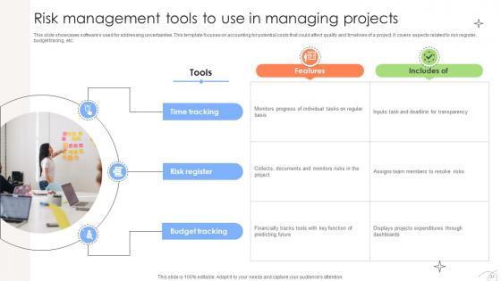This slide showcases softwares used for addressing uncertainties. This template focuses on accounting for potential costs that could affect quality and timelines of a project. It covers aspects related to risk register, budget tracing, etc. Explore a selection of the finest Executing And Monitoring Project Risk Management Tools To Use In Managing Projects PM SS V here. With a plethora of professionally designed and pre-made slide templates, you can quickly and easily find the right one for your upcoming presentation. You can use our Executing And Monitoring Project Risk Management Tools To Use In Managing Projects PM SS V to effectively convey your message to a wider audience. Slidegeeks has done a lot of research before preparing these presentation templates. The content can be personalized and the slides are highly editable. Grab templates today from Slidegeeks. This slide showcases softwares used for addressing uncertainties. This template focuses on accounting for potential costs that could affect quality and timelines of a project. It covers aspects related to risk register, budget tracing, etc.