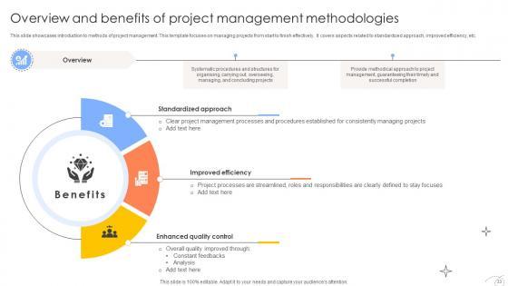 This slide showcases introduction to methods of project management. This template focuses on managing projects from start to finish effectively. It covers aspects related to standardized approach, improved efficiency, etc. Retrieve professionally designed Executing And Monitoring Project Using Overview And Benefits Of Project Management PM SS V to effectively convey your message and captivate your listeners. Save time by selecting pre-made slideshows that are appropriate for various topics, from business to educational purposes. These themes come in many different styles, from creative to corporate, and all of them are easily adjustable and can be edited quickly. Access them as PowerPoint templates or as Google Slides themes. You do not have to go on a hunt for the perfect presentation because Slidegeeks got you covered from everywhere. This slide showcases introduction to methods of project management. This template focuses on managing projects from start to finish effectively. It covers aspects related to standardized approach, improved efficiency, etc.