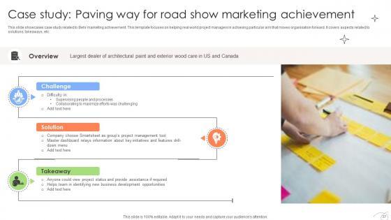 This slide showcases case study related to Behr marketing achievement. This template focuses on helping real world project managers in achieving particular aim that moves organisation forward. It covers aspects related to solutions, takeaways, etc. Slidegeeks is one of the best resources for PowerPoint templates. You can download easily and regulate Executing And Monitoring Project Case Study Paving Way For Road Show PM SS V for your personal presentations from our wonderful collection. A few clicks is all it takes to discover and get the most relevant and appropriate templates. Use our Templates to add a unique zing and appeal to your presentation and meetings. All the slides are easy to edit and you can use them even for advertisement purposes. This slide showcases case study related to Behr marketing achievement. This template focuses on helping real world project managers in achieving particular aim that moves organisation forward. It covers aspects related to solutions, takeaways, etc.