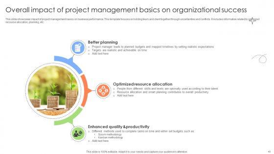 This slide showcases impact of project management basics on business performance. This template focuses on holding team and client together through uncertainties and conflicts. It includes information related to optimized recourse allocation, planning, etc. Crafting an eye-catching presentation has never been more straightforward. Let your presentation shine with this tasteful yet straightforward Executing And Monitoring Project Overall Impact Of Project Management Basics PM SS V template. It offers a minimalistic and classy look that is great for making a statement. The colors have been employed intelligently to add a bit of playfulness while still remaining professional. Construct the ideal Executing And Monitoring Project Overall Impact Of Project Management Basics PM SS V that effortlessly grabs the attention of your audience Begin now and be certain to wow your customers This slide showcases impact of project management basics on business performance. This template focuses on holding team and client together through uncertainties and conflicts. It includes information related to optimized recourse allocation, planning, etc.