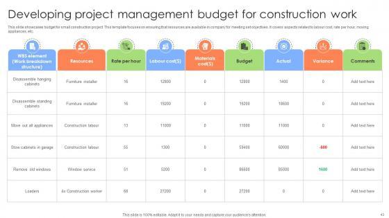 This slide showcases budget for small construction project. This template focuses on ensuring that resources are available in company for meeting set objectives. It covers aspects related to labour cost, rate per hour, moving appliances, etc, Do you have to make sure that everyone on your team knows about any specific topic I yes, then you should give Executing And Monitoring Project Developing Project Management Budget PM SS V a try. Our experts have put a lot of knowledge and effort into creating this impeccable Executing And Monitoring Project Developing Project Management Budget PM SS V. You can use this template for your upcoming presentations, as the slides are perfect to represent even the tiniest detail. You can download these templates from the Slidegeeks website and these are easy to edit. So grab these today This slide showcases budget for small construction project. This template focuses on ensuring that resources are available in company for meeting set objectives. It covers aspects related to labour cost, rate per hour, moving appliances, etc.