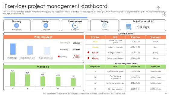 This slide showcases metrics related to information technology services. This template focuses on monitoring success of project and campaigns ultimately contributing to making organisation intelligent. It includes information related to budget, overdue tasks, etc. Are you in need of a template that can accommodate all of your creative concepts This one is crafted professionally and can be altered to fit any style. Use it with Google Slides or PowerPoint. Include striking photographs, symbols, depictions, and other visuals. Fill, move around, or remove text boxes as desired. Test out color palettes and font mixtures. Edit and save your work, or work with colleagues. Download Executing And Monitoring Project It Services Project Management Dashboard PM SS V and observe how to make your presentation outstanding. Give an impeccable presentation to your group and make your presentation unforgettable. This slide showcases metrics related to information technology services. This template focuses on monitoring success of project and campaigns ultimately contributing to making organisation intelligent. It includes information related to budget, overdue tasks, etc.