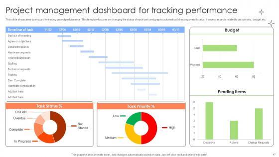 This slide showcases dashboard for tracing project performance. This template focuses on changing the status of each task and graphs automatically tracking overall status. It covers aspects related to task priority, budget, etc. Slidegeeks has constructed Executing And Monitoring Project Using Project Management Dashboard For Tracking PM SS V after conducting extensive research and examination. These presentation templates are constantly being generated and modified based on user preferences and critiques from editors. Here, you will find the most attractive templates for a range of purposes while taking into account ratings and remarks from users regarding the content. This is an excellent jumping-off point to explore our content and will give new users an insight into our top-notch PowerPoint Templates. This slide showcases dashboard for tracing project performance. This template focuses on changing the status of each task and graphs automatically tracking overall status. It covers aspects related to task priority, budget, etc.