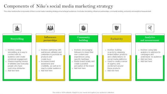 This slide mentions the components of Nikes social media marketing strategy aimed at target audiences. It includes storytelling, influencer partnerships, community building, exclusivity and analytics or measurement. From laying roadmaps to briefing everything in detail, our templates are perfect for you. You can set the stage with your presentation slides. All you have to do is download these easy to edit and customizable templates. How Nike Developed And Executed Strategic Promotion Techniques Components Of Nikes Ideas PDF will help you deliver an outstanding performance that everyone would remember and praise you for. Do download this presentation today.