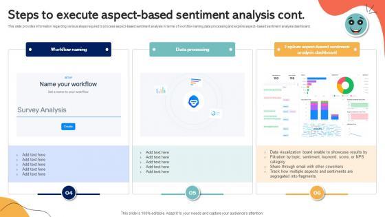 This slide provides information regarding various steps required to process aspect-based sentiment analysis in terms of selection of NPS template, uploading data and matching data to suitable field in each column. Crafting an eye-catching presentation has never been more straightforward. Let your presentation shine with this tasteful yet straightforward Steps To Execute Aspect Based Sentiment Analysis Emotionally Intelligent Insights Leveraging AI SS V template. It offers a minimalistic and classy look that is great for making a statement. The colors have been employed intelligently to add a bit of playfulness while still remaining professional. Construct the ideal Steps To Execute Aspect Based Sentiment Analysis Emotionally Intelligent Insights Leveraging AI SS V that effortlessly grabs the attention of your audience Begin now and be certain to wow your customers This slide provides information regarding various steps required to process aspect-based sentiment analysis in terms of selection of NPS template, uploading data and matching data to suitable field in each column.