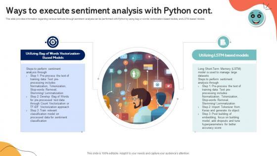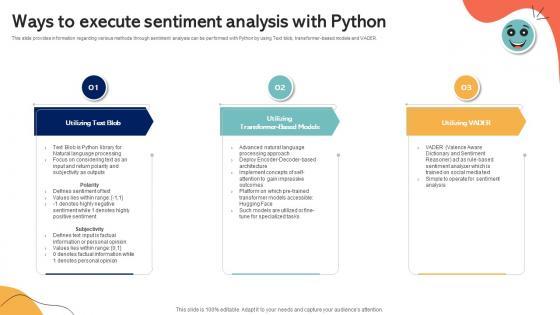 This slide provides information regarding various methods through sentiment analysis can be performed with Python by using Text blob, transformer-based models and VADER. Welcome to our selection of the Ways To Execute Sentiment Analysis With Python Emotionally Intelligent Insights Leveraging AI SS V. These are designed to help you showcase your creativity and bring your sphere to life. Planning and Innovation are essential for any business that is just starting out. This collection contains the designs that you need for your everyday presentations. All of our PowerPoints are 100 percent editable, so you can customize them to suit your needs. This multi-purpose template can be used in various situations. Grab these presentation templates today. This slide provides information regarding various methods through sentiment analysis can be performed with Python by using Text blob, transformer-based models and VADER.