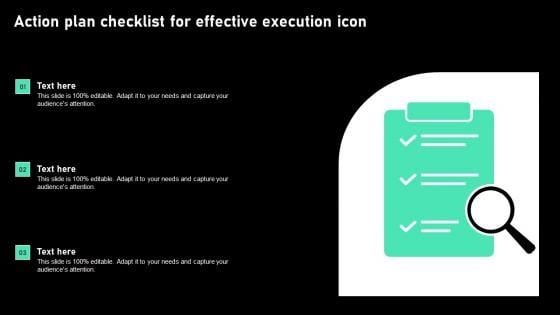 Showcasing this set of slides titled Action Plan Checklist For Effective Execution Icon Professional Pdf. The topics addressed in these templates are Action Plan Checklist,Effective Execution Icon. All the content presented in this PPT design is completely editable. Download it and make adjustments in color,background,font etc. as per your unique business setting. Our Action Plan Checklist For Effective Execution Icon Professional Pdf are topically designed to provide an attractive backdrop to any subject. Use them to look like a presentation pro.