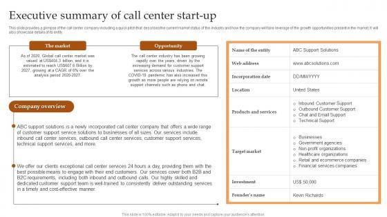 This slide provides a glimpse of the call center company including a quick pitch that describes the current market status of the industry and how the company will take leverage of the growth opportunities present in the market. It will also showcase details of its entity. The best PPT templates are a great way to save time, energy, and resources. Slidegeeks have 100 percent editable powerpoint slides making them incredibly versatile. With these quality presentation templates, you can create a captivating and memorable presentation by combining visually appealing slides and effectively communicating your message. Download Executive Summary Of Call Center Start Up IT And Tech Support Business Background Pdf from Slidegeeks and deliver a wonderful presentation. This slide provides a glimpse of the call center company including a quick pitch that describes the current market status of the industry and how the company will take leverage of the growth opportunities present in the market. It will also showcase details of its entity.