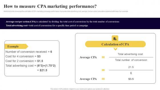 Mentioned slide showcase the estimation of CPA marketing campaign performance. It provides total advertising cost, average cost per action calculation explained with help of an example. If you are looking for a format to display your unique thoughts, then the professionally designed How To Measure CPA Marketing Performance Executing Cost Per Action Marketing Designs Pdf is the one for you. You can use it as a Google Slides template or a PowerPoint template. Incorporate impressive visuals, symbols, images, and other charts. Modify or reorganize the text boxes as you desire. Experiment with shade schemes and font pairings. Alter, share or cooperate with other people on your work. Download How To Measure CPA Marketing Performance Executing Cost Per Action Marketing Designs Pdf and find out how to give a successful presentation. Present a perfect display to your team and make your presentation unforgettable. Mentioned slide showcase the estimation of CPA marketing campaign performance. It provides total advertising cost, average cost per action calculation explained with help of an example.