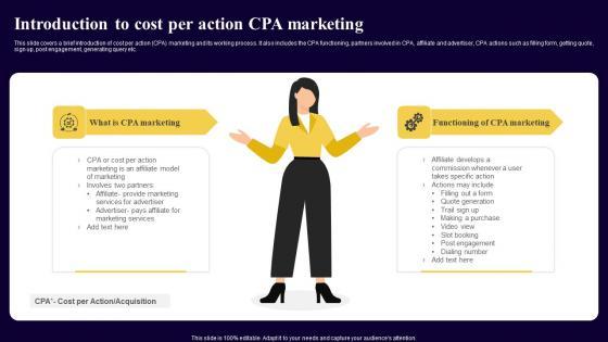 This slide covers a brief introduction of cost per action CPA marketing and its working process. It also includes the CPA functioning, partners involved in CPA, affiliate and advertiser, CPA actions such as filling form, getting quote, sign up, post engagement, generating query etc. Crafting an eye-catching presentation has never been more straightforward. Let your presentation shine with this tasteful yet straightforward Introduction To Cost Per Action CPA Marketing Executing Cost Per Action Marketing Pictures Pdf template. It offers a minimalistic and classy look that is great for making a statement. The colors have been employed intelligently to add a bit of playfulness while still remaining professional. Construct the ideal Introduction To Cost Per Action CPA Marketing Executing Cost Per Action Marketing Pictures Pdf that effortlessly grabs the attention of your audience. Begin now and be certain to wow your customers. This slide covers a brief introduction of cost per action CPA marketing and its working process. It also includes the CPA functioning, partners involved in CPA, affiliate and advertiser, CPA actions such as filling form, getting quote, sign up, post engagement, generating query etc.
