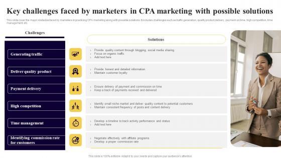 This slide cover the major obstacles faced by marketers in practicing CPA marketing along with possible solutions. It includes challenges such as traffic generation, quality product delivery, payment on time, high competition, time management, etc. Make sure to capture your audiences attention in your business displays with our gratis customizable Key Challenges Faced By Marketers In CPA Executing Cost Per Action Marketing Brochure Pdf. These are great for business strategies, office conferences, capital raising or task suggestions. If you desire to acquire more customers for your tech business and ensure they stay satisfied, create your own sales presentation with these plain slides. This slide cover the major obstacles faced by marketers in practicing CPA marketing along with possible solutions. It includes challenges such as traffic generation, quality product delivery, payment on time, high competition, time management, etc.