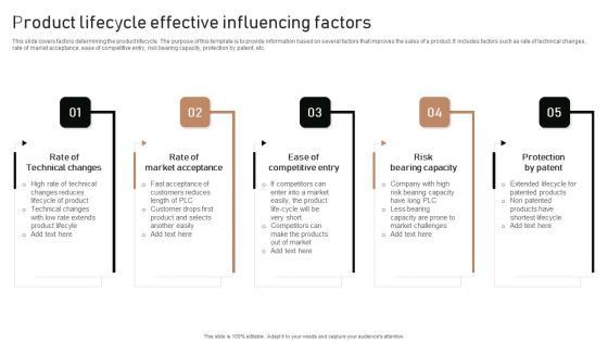 This slide covers factors determining the product lifecycle. The purpose of this template is to provide information based on several factors that improves the sales of a product. It includes factors such as rate of technical changes, rate of market acceptance, ease of competitive entry, risk bearing capacity, protection by patent, etc. The Execution Of Product Lifecycle Product Lifecycle Effective Influencing Factors Guidelines Pdf is a compilation of the most recent design trends as a series of slides. It is suitable for any subject or industry presentation, containing attractive visuals and photo spots for businesses to clearly express their messages. This template contains a variety of slides for the user to input data, such as structures to contrast two elements, bullet points, and slides for written information. Slidegeeks is prepared to create an impression. This slide covers factors determining the product lifecycle. The purpose of this template is to provide information based on several factors that improves the sales of a product. It includes factors such as rate of technical changes, rate of market acceptance, ease of competitive entry, risk bearing capacity, protection by patent, etc.