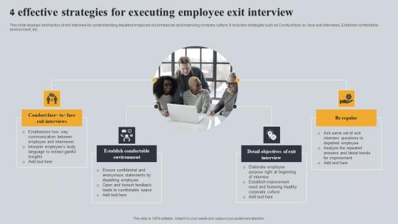 This slide displays best tactics of exit interview for understanding departed employee circumstances and improving company culture. It includes strategies such as Conduct face- to- face exit interviews, Establish comfortable environment, etc. Showcasing this set of slides titled 4 Effective Strategies For Executing Employee Exit Interview Slides Pdf The topics addressed in these templates are Exit Interviews, Comfortable Environment, Be Regular All the content presented in this PPT design is completely editable. Download it and make adjustments in color, background, font etc. as per your unique business setting. This slide displays best tactics of exit interview for understanding departed employee circumstances and improving company culture. It includes strategies such as Conduct face- to- face exit interviews, Establish comfortable environment, etc.