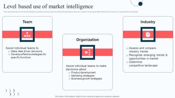This slide presents use of market intelligence based on various levels for informed and data driven decision making. It showcases different levels such as teams, organizations and industry. Slidegeeks is here to make your presentations a breeze with Level Based Use Of Market Intelligence Execution Of Strategic Intelligence Professional PDF With our easy-to-use and customizable templates, you can focus on delivering your ideas rather than worrying about formatting. With a variety of designs to choose from, you are sure to find one that suits your needs. And with animations and unique photos, illustrations, and fonts, you can make your presentation pop. So whether you are giving a sales pitch or presenting to the board, make sure to check out Slidegeeks first This slide presents use of market intelligence based on various levels for informed and data driven decision making. It showcases different levels such as teams, organizations and industry.