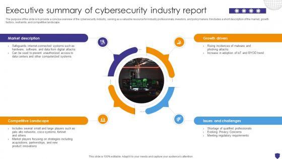 The purpose of the slide is to provide a concise overview of the cybersecurity industry, serving as a valuable resource for industry professionals, investors, and policymakers. It includes a short description of the market, growth factors, restraints, and competitive landscape. Do you have an important presentation coming up Are you looking for something that will make your presentation stand out from the rest Look no further than Global Data Security Industry Report Executive Summary Of Cybersecurity Industry Report IR SS V. With our professional designs, you can trust that your presentation will pop and make delivering it a smooth process. And with Slidegeeks, you can trust that your presentation will be unique and memorable. So why wait Grab Global Data Security Industry Report Executive Summary Of Cybersecurity Industry Report IR SS V today and make your presentation stand out from the rest The purpose of the slide is to provide a concise overview of the cybersecurity industry, serving as a valuable resource for industry professionals, investors, and policymakers. It includes a short description of the market, growth factors, restraints, and competitive landscape.