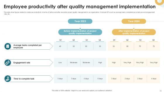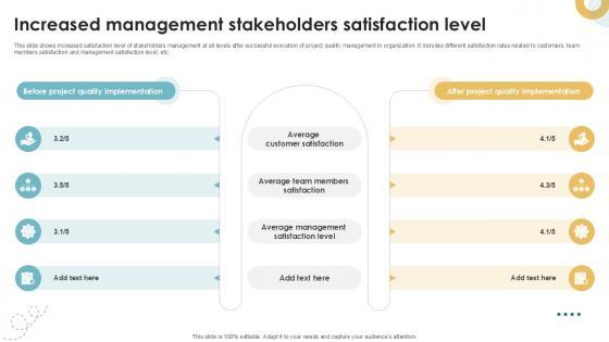 This slide shows increased satisfaction level of stakeholders management at all levels after successful execution of project quality management in organization. It includes different satisfaction rates related to customers, team members satisfaction and management satisfaction level, etc. This modern and well-arranged Increased Management Stakeholders Executing Quality Ppt Example PM SS V provides lots of creative possibilities. It is very simple to customize and edit with the Powerpoint Software. Just drag and drop your pictures into the shapes. All facets of this template can be edited with Powerpoint, no extra software is necessary. Add your own material, put your images in the places assigned for them, adjust the colors, and then you can show your slides to the world, with an animated slide included. This slide shows increased satisfaction level of stakeholders management at all levels after successful execution of project quality management in organization. It includes different satisfaction rates related to customers, team members satisfaction and management satisfaction level, etc.