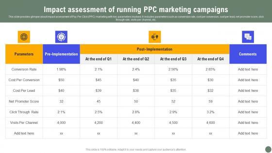 This slide provides glimpse about impact assessment of Pay Per Click PPC marketing with key parameters involved. It includes parameters such as conversion rate, cost per conversion, cost per lead, net promoter score, click through rate, visits per channel, etc. Crafting an eye catching presentation has never been more straightforward. Let your presentation shine with this tasteful yet straightforward Impact Assessment Running Exhaustive Guide Of Pay Per Click Advertising Initiatives Sample Pdf template. It offers a minimalistic and classy look that is great for making a statement. The colors have been employed intelligently to add a bit of playfulness while still remaining professional. Construct the ideal Impact Assessment Running Exhaustive Guide Of Pay Per Click Advertising Initiatives Sample Pdf that effortlessly grabs the attention of your audience Begin now and be certain to wow your customers This slide provides glimpse about impact assessment of Pay Per Click PPC marketing with key parameters involved. It includes parameters such as conversion rate, cost per conversion, cost per lead, net promoter score, click through rate, visits per channel, etc.