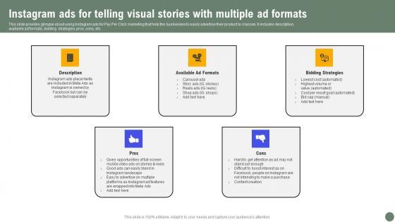 This slide provides glimpse about using Instagram ads for Pay Per Click marketing that help the businesses to easily advertise their product to masses. It includes description, available ad formats, bidding strategies, pros, cons, etc. Make sure to capture your audiences attention in your business displays with our gratis customizable Instagram Ads For Telling Visual Exhaustive Guide Of Pay Per Click Advertising Initiative Infographics Pdf. These are great for business strategies, office conferences, capital raising or task suggestions. If you desire to acquire more customers for your tech business and ensure they stay satisfied, create your own sales presentation with these plain slides. This slide provides glimpse about using Instagram ads for Pay Per Click marketing that help the businesses to easily advertise their product to masses. It includes description, available ad formats, bidding strategies, pros, cons, etc.