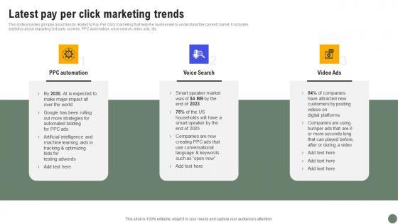 This slide provides glimpse about trends related to Pay Per Click marketing that help the businesses to understand the current market. It includes statistics about departing 3rd party cookies, PPC automation, voice search, video ads, etc. Coming up with a presentation necessitates that the majority of the effort goes into the content and the message you intend to convey. The visuals of a PowerPoint presentation can only be effective if it supplements and supports the story that is being told. Keeping this in mind our experts created Latest Pay Per Click Marketing Exhaustive Guide Of Pay Per Click Advertising Initiatives Microsoft Pdf to reduce the time that goes into designing the presentation. This way, you can concentrate on the message while our designers take care of providing you with the right template for the situation. This slide provides glimpse about trends related to Pay Per Click marketing that help the businesses to understand the current market. It includes statistics about departing 3rd party cookies, PPC automation, voice search, video ads, etc.