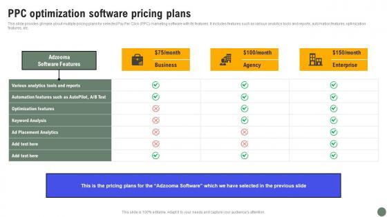 This slide provides glimpse about multiple pricing plans for selected Pay Per Click PPC marketing software with its features. It includes features such as various analytics tools and reports, automation features, optimization features, etc. Retrieve professionally designed PPC Optimization Software Exhaustive Guide Of Pay Per Click Advertising Initiatives Demonstration Pdf to effectively convey your message and captivate your listeners. Save time by selecting pre made slideshows that are appropriate for various topics, from business to educational purposes. These themes come in many different styles, from creative to corporate, and all of them are easily adjustable and can be edited quickly. Access them as PowerPoint templates or as Google Slides themes. You do not have to go on a hunt for the perfect presentation because Slidegeeks got you covered from everywhere. This slide provides glimpse about multiple pricing plans for selected Pay Per Click PPC marketing software with its features. It includes features such as various analytics tools and reports, automation features, optimization features, etc.