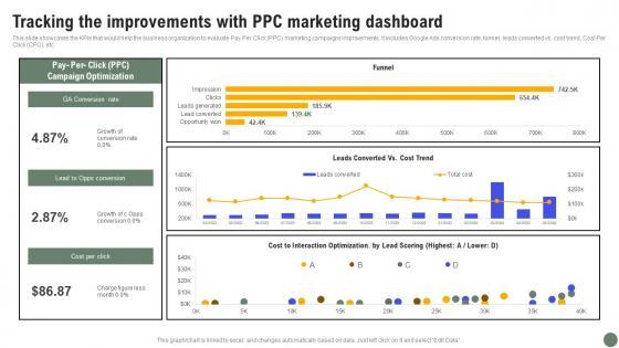 This slide showcases the KPIs that would help the business organization to evaluate Pay Per Click PPC marketing campaigns improvements. It includes Google Ads conversion rate, funnel, leads converted vs. cost trend, Cost Per Click CPC, etc. Do you know about Slidesgeeks Tracking The Improvements Exhaustive Guide Of Pay Per Click Advertising Initiatives Topics Pdf These are perfect for delivering any kind od presentation. Using it, create PowerPoint presentations that communicate your ideas and engage audiences. Save time and effort by using our pre designed presentation templates that are perfect for a wide range of topic. Our vast selection of designs covers a range of styles, from creative to business, and are all highly customizable and easy to edit. Download as a PowerPoint template or use them as Google Slides themes. This slide showcases the KPIs that would help the business organization to evaluate Pay Per Click PPC marketing campaigns improvements. It includes Google Ads conversion rate, funnel, leads converted vs. cost trend, Cost Per Click CPC, etc.