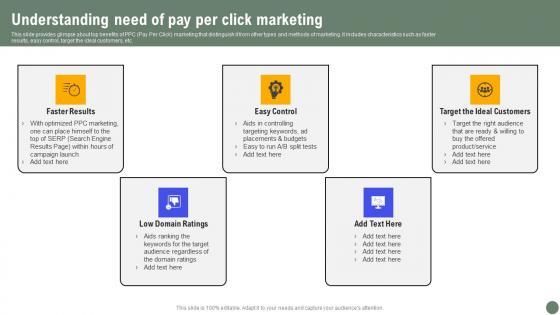 This slide provides glimpse about top benefits of PPC Pay Per Click marketing that distinguish it from other types and methods of marketing. It includes characteristics such as faster results, easy control, target the ideal customers, etc. Find a pre designed and impeccable Understanding Need Of Pay Exhaustive Guide Of Pay Per Click Advertising Initiatives Elements Pdf. The templates can ace your presentation without additional effort. You can download these easy to edit presentation templates to make your presentation stand out from others. So, what are you waiting for Download the template from Slidegeeks today and give a unique touch to your presentation. This slide provides glimpse about top benefits of PPC Pay Per Click marketing that distinguish it from other types and methods of marketing. It includes characteristics such as faster results, easy control, target the ideal customers, etc.