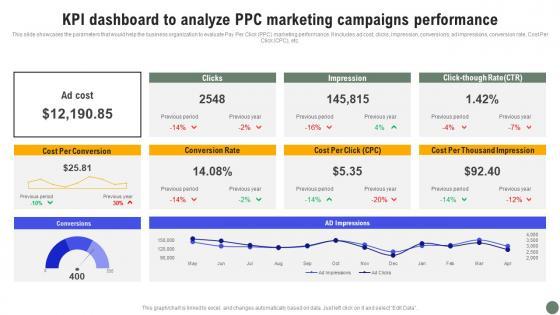 This slide showcases the parameters that would help the business organization to evaluate Pay Per Click PPC marketing performance. It includes ad cost, clicks, impression, conversions, ad impressions, conversion rate, Cost Per Click CPC, etc. Formulating a presentation can take up a lot of effort and time, so the content and message should always be the primary focus. The visuals of the PowerPoint can enhance the presenters message, so our KPI Dashboard To Analyze PPC Exhaustive Guide Of Pay Per Click Advertising Initiatives Inspiration Pdf was created to help save time. Instead of worrying about the design, the presenter can concentrate on the message while our designers work on creating the ideal templates for whatever situation is needed. Slidegeeks has experts for everything from amazing designs to valuable content, we have put everything into KPI Dashboard To Analyze PPC Exhaustive Guide Of Pay Per Click Advertising Initiatives Inspiration Pdf This slide showcases the parameters that would help the business organization to evaluate Pay Per Click PPC marketing performance. It includes ad cost, clicks, impression, conversions, ad impressions, conversion rate, Cost Per Click CPC, etc.