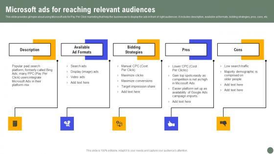 This slide provides glimpse about using Microsoft ads for Pay Per Click marketing that help the businesses to display the ads in front of right audiences. It includes description, available ad formats, bidding strategies, pros, cons, etc. Welcome to our selection of the Microsoft Ads For Reaching Exhaustive Guide Of Pay Per Click Advertising Initiatives Template Pdf. These are designed to help you showcase your creativity and bring your sphere to life. Planning and Innovation are essential for any business that is just starting out. This collection contains the designs that you need for your everyday presentations. All of our PowerPoints are 100 percent editable, so you can customize them to suit your needs. This multi purpose template can be used in various situations. Grab these presentation templates today This slide provides glimpse about using Microsoft ads for Pay Per Click marketing that help the businesses to display the ads in front of right audiences. It includes description, available ad formats, bidding strategies, pros, cons, etc.