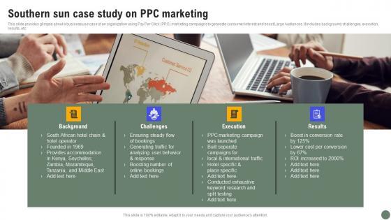 This slide provides glimpse about a business use case of an organization using Pay Per Click PPC marketing campaigns to generate consumer interest and boost Large Audiences. It includes background, challenges, execution, results, etc. Presenting this PowerPoint presentation, titled Southern Sun Case Study Exhaustive Guide Of Pay Per Click Advertising Initiatives Download Pdf, with topics curated by our researchers after extensive research. This editable presentation is available for immediate download and provides attractive features when used. Download now and captivate your audience. Presenting this Southern Sun Case Study Exhaustive Guide Of Pay Per Click Advertising Initiatives Download Pdf. Our researchers have carefully researched and created these slides with all aspects taken into consideration. This is a completely customizable Southern Sun Case Study Exhaustive Guide Of Pay Per Click Advertising Initiatives Download Pdf that is available for immediate downloading. Download now and make an impact on your audience. Highlight the attractive features available with our PPTs. This slide provides glimpse about a business use case of an organization using Pay Per Click PPC marketing campaigns to generate consumer interest and boost Large Audiences. It includes background, challenges, execution, results, etc.