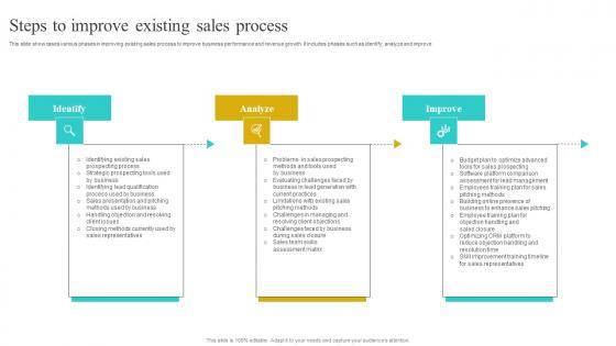 This slide showcases various phases in improving existing sales process to improve business performance and revenue growth. It includes phases such as identify, analyze and improve. Find highly impressive Steps To Improve Existing Sales Process Formats PDF on Slidegeeks to deliver a meaningful presentation. You can save an ample amount of time using these presentation templates. No need to worry to prepare everything from scratch because Slidegeeks experts have already done a huge research and work for you. You need to download Steps To Improve Existing Sales Process Formats PDF for your upcoming presentation. All the presentation templates are 100 percent editable and you can change the color and personalize the content accordingly. Download now.