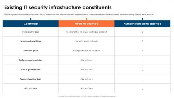 This slide highlights the components of the current IT security infrastructure, which are prone to several functionality concerns. These constituents are vulnerability scanners, improper functioning, functional disrupt, and so on. From laying roadmaps to briefing everything in detail, our templates are perfect for you. You can set the stage with your presentation slides. All you have to do is download these easy-to-edit and customizable templates. Existing It Security Infrastructure Constituents Corrective Regression Testing Ppt Slides will help you deliver an outstanding performance that everyone would remember and praise you for. Do download this presentation today. This slide highlights the components of the current IT security infrastructure, which are prone to several functionality concerns. These constituents are vulnerability scanners, improper functioning, functional disrupt, and so on.