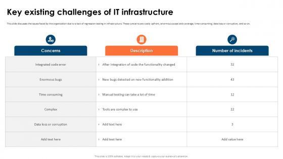 This slide discusses the issues faced by the organization due to a lack of regression testing in infrastructure. These concerns are costly upfront, enormous scope and coverage, time-consuming, data loss or corruption, and so on. Slidegeeks is here to make your presentations a breeze with Key Existing Challenges Of It Automated Regression Testing And Achieving PPT Example With our easy-to-use and customizable templates, you can focus on delivering your ideas rather than worrying about formatting. With a variety of designs to choose from, you are sure to find one that suits your needs. And with animations and unique photos, illustrations, and fonts, you can make your presentation pop. So whether you are giving a sales pitch or presenting to the board, make sure to check out Slidegeeks first This slide discusses the issues faced by the organization due to a lack of regression testing in infrastructure. These concerns are costly upfront, enormous scope and coverage, time-consuming, data loss or corruption, and so on.