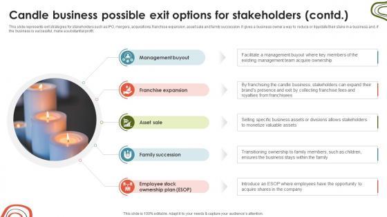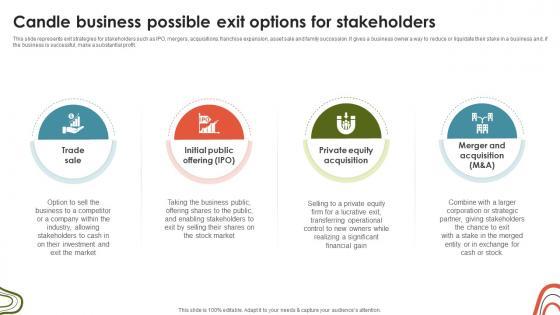 This slide represents exit strategies for stakeholders such as IPO, mergers, acquisitions, franchise expansion, asset sale and family succession. It gives a business owner a way to reduce or liquidate their stake in a business and, if the business is successful, make a substantial profit. There are so many reasons you need a Candle Business Venture Candle Business Possible Exit Options For Stakeholders BP SS V. The first reason is you can not spend time making everything from scratch, Thus, Slidegeeks has made presentation templates for you too. You can easily download these templates from our website easily. This slide represents exit strategies for stakeholders such as IPO, mergers, acquisitions, franchise expansion, asset sale and family succession. It gives a business owner a way to reduce or liquidate their stake in a business and, if the business is successful, make a substantial profit.