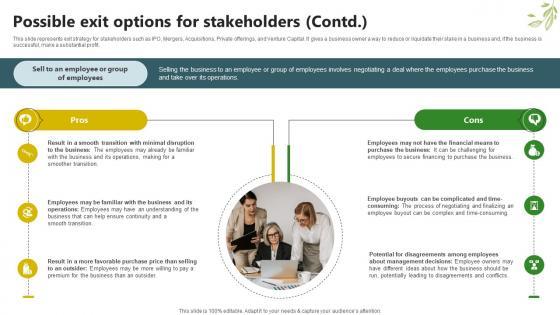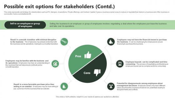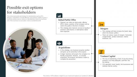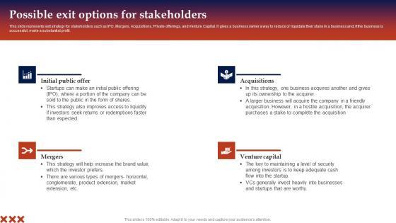 This slide represents exit strategy for stakeholders such as IPO, Mergers, Acquisitions, Private offerings, and Venture Capital. It gives a business owner a way to reduce or liquidate their stake in a business and, if the business is successful, make a substantial profit. Are you searching for a Possible Exit Options For Stakeholders Icons PDF that is uncluttered, straightforward, and original Its easy to edit, and you can change the colors to suit your personal or business branding. For a presentation that expresses how much effort you have put in, this template is ideal With all of its features, including tables, diagrams, statistics, and lists, its perfect for a business plan presentation. Make your ideas more appealing with these professional slides. Download Possible Exit Options For Stakeholders Icons PDF from Slidegeeks today.