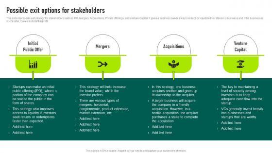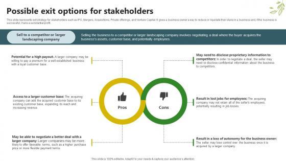 This slide represents exit strategy for stakeholders such as IPO, Mergers, Acquisitions, Private offerings, and Venture Capital. It gives a business owner a way to reduce or liquidate their stake in a business and, if the business is successful, make a substantial profit. The best PPT templates are a great way to save time, energy, and resources. Slidegeeks have 100 percent editable powerpoint slides making them incredibly versatile. With these quality presentation templates, you can create a captivating and memorable presentation by combining visually appealing slides and effectively communicating your message. Download Possible Exit Options For Stakeholders Lawn Care BP SS V from Slidegeeks and deliver a wonderful presentation. This slide represents exit strategy for stakeholders such as IPO, Mergers, Acquisitions, Private offerings, and Venture Capital. It gives a business owner a way to reduce or liquidate their stake in a business and, if the business is successful, make a substantial profit.