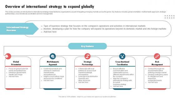 This slides provides an introduction to international strategy implemented by organizations as part of targeting emerging markets across the globe. Key features includes global orientation, multidomestic approach, strategic partnerships, cross functional coordination and risk management. Here you can discover an assortment of the finest PowerPoint and Google Slides templates. With these templates, you can create presentations for a variety of purposes while simultaneously providing your audience with an eye-catching visual experience. Download Overview Of International Strategy To Expand Globally International Strategy Corporations Clipart Pdf to deliver an impeccable presentation. These templates will make your job of preparing presentations much quicker, yet still, maintain a high level of quality. Slidegeeks has experienced researchers who prepare these templates and write high-quality content for you. Later on, you can personalize the content by editing the Overview Of International Strategy To Expand Globally International Strategy Corporations Clipart Pdf. This slides provides an introduction to international strategy implemented by organizations as part of targeting emerging markets across the globe. Key features includes global orientation, multidomestic approach, strategic partnerships, cross functional coordination and risk management.
