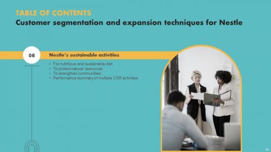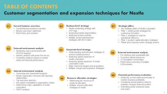 Coming up with a presentation necessitates that the majority of the effort goes into the content and the message you intend to convey. The visuals of a PowerPoint presentation can only be effective if it supplements and supports the story that is being told. Keeping this in mind our experts created Customer Segmentation And Expansion Techniques For Nestle Table Of Contents Pictures Pdf to reduce the time that goes into designing the presentation. This way, you can concentrate on the message while our designers take care of providing you with the right template for the situation. Our Customer Segmentation And Expansion Techniques For Nestle Table Of Contents Pictures Pdf are topically designed to provide an attractive backdrop to any subject. Use them to look like a presentation pro.