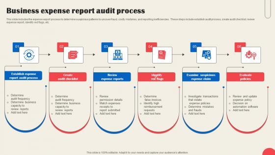 This slide includes the expense export process to determine suspicious patterns to uncover fraud, costly mistakes, and reporting inefficiencies. These steps include establish audit process, create audit checklist, review expense report, identify red flags, etc. Showcasing this set of slides titled Business Expense Report Audit Process Download Pdf The topics addressed in these templates are Establish Expense, Create Audit Checklist, Identify Red Flags All the content presented in this PPT design is completely editable. Download it and make adjustments in color, background, font etc. as per your unique business setting. This slide includes the expense export process to determine suspicious patterns to uncover fraud, costly mistakes, and reporting inefficiencies. These steps include establish audit process, create audit checklist, review expense report, identify red flags, etc.