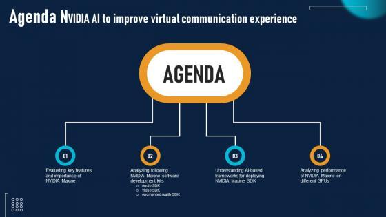 The best PPT templates are a great way to save time, energy, and resources. Slidegeeks have 100 percent editable powerpoint slides making them incredibly versatile. With these quality presentation templates, you can create a captivating and memorable presentation by combining visually appealing slides and effectively communicating your message. Download Agenda NVIDIA AI To Improve Virtual Communication Experience Graphics Pdf from Slidegeeks and deliver a wonderful presentation. Our Agenda NVIDIA AI To Improve Virtual Communication Experience Graphics Pdf are topically designed to provide an attractive backdrop to any subject. Use them to look like a presentation pro.