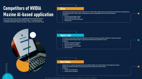 This slide showcases various competitors that are offering similar AI image and video services like NVIDIA Maxine. Companies giving competition to NVIDIA Maxine are iSize, Topaz Labs and Neat Video. Do you know about Slidesgeeks NVIDIA AI To Improve Virtual Communication Experience Competitors Of NVIDIA Maxine Mockup Pdf These are perfect for delivering any kind od presentation. Using it, create PowerPoint presentations that communicate your ideas and engage audiences. Save time and effort by using our pre designed presentation templates that are perfect for a wide range of topic. Our vast selection of designs covers a range of styles, from creative to business, and are all highly customizable and easy to edit. Download as a PowerPoint template or use them as Google Slides themes. This slide showcases various competitors that are offering similar AI image and video services like NVIDIA Maxine. Companies giving competition to NVIDIA Maxine are iSize, Topaz Labs and Neat Video.