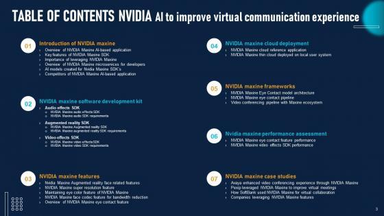 Find a pre designed and impeccable NVIDIA AI To Improve Virtual Communication Experience Table Of Contents Graphics Pdf. The templates can ace your presentation without additional effort. You can download these easy to edit presentation templates to make your presentation stand out from others. So, what are you waiting for Download the template from Slidegeeks today and give a unique touch to your presentation. Our NVIDIA AI To Improve Virtual Communication Experience Table Of Contents Graphics Pdf are topically designed to provide an attractive backdrop to any subject. Use them to look like a presentation pro.